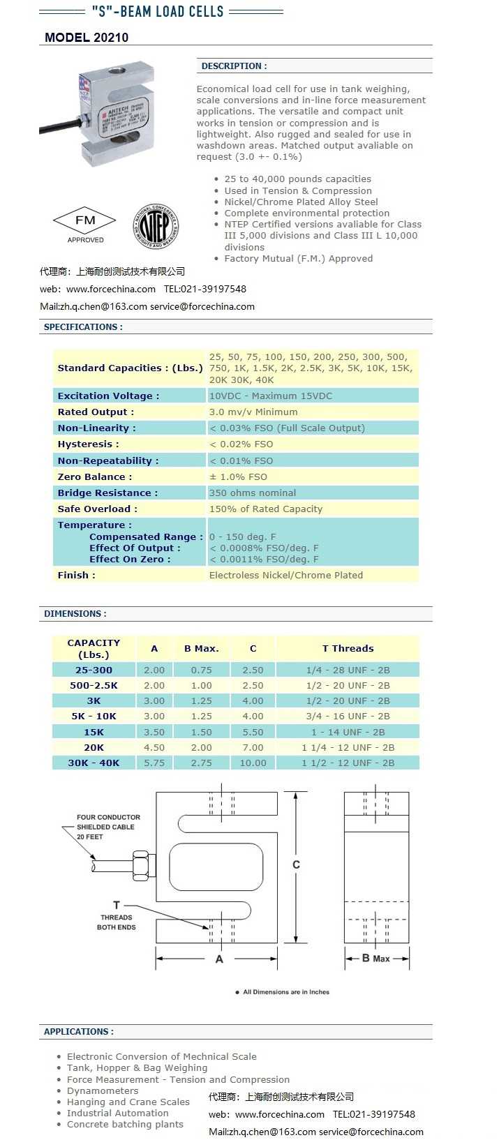 美國Artech標(biāo)準(zhǔn)S型測力傳感器Model20210/S型拉壓力傳感器/25到40000磅的量程選擇