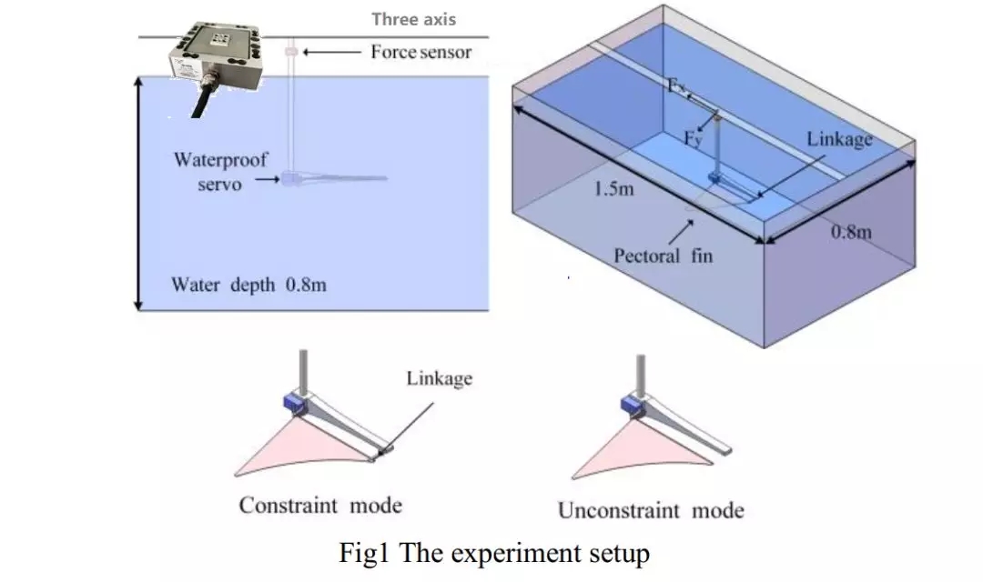 本實驗主要測試胸鰭鰭面在水下進行搖翼動作所產(chǎn)生的各向應(yīng)力以及不同胸鰭鰭面鰭條參數(shù)對推進力產(chǎn)生的影響;