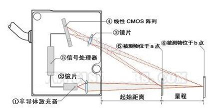 激光發(fā)射器通過鏡頭將可見紅色激光射向被測物體表面,經(jīng)物體反射的激光通過接收器鏡頭,被內(nèi)部的CCD線性相機接收,根據(jù)不同的距離,CCD線性相機可以在不同的角度下“看見”這個光點。根據(jù)這個角度及已知的激光和相機之間的距離,數(shù)字信號處理器就能計算出傳感器和被測物體之間的距離。