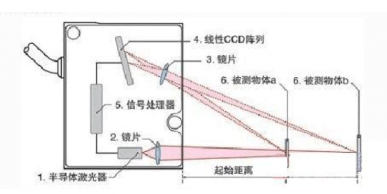 半導(dǎo)體激光器①被鏡片②聚焦到被測物體⑥。反射光被鏡片③收集,投射到CMOS陣列④上;信號處理器⑤通過三角函數(shù)計算陣列④上的光點位置得到距物體的距離。